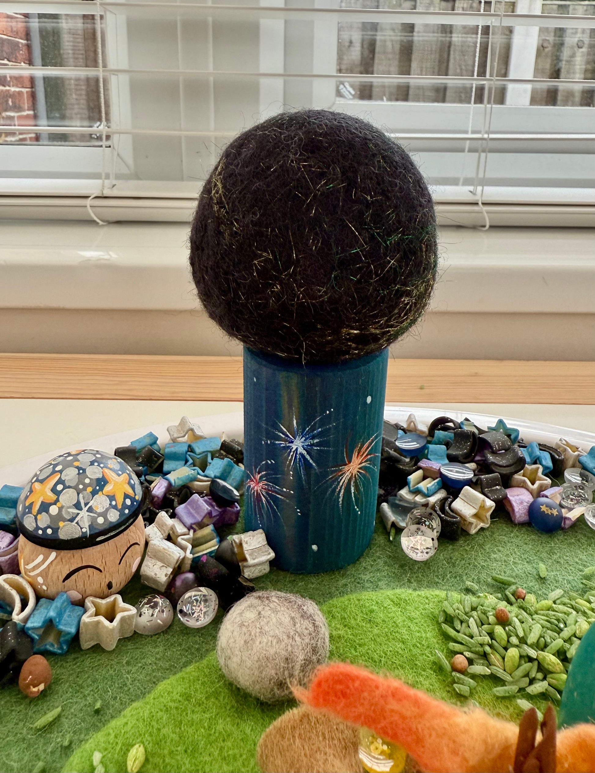 A handcrafted felt tree made with deep charcoal wool, streaked with subtle green and gold sparkling fibre that give it a magical nighttime shimmer. The wooden trunk is painted a rich midnight blue and decorated with tiny fireworks bursting above a glowing bonfire scene — a perfect nod to Bonfire Night and the cozy magic that comes with it.