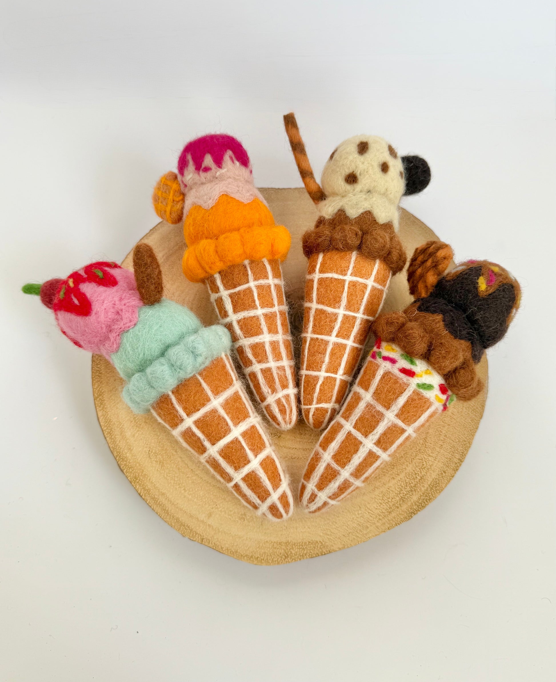 Say hello to the cutest pretend treats ever! These soft, squishy felt ice-creams are ready for big adventures in your little one’s hands. Will today’s game be an ice cream shop, a teddy bear picnic, or a silly ice cream dance? It’s up to your kiddo’s imagination.