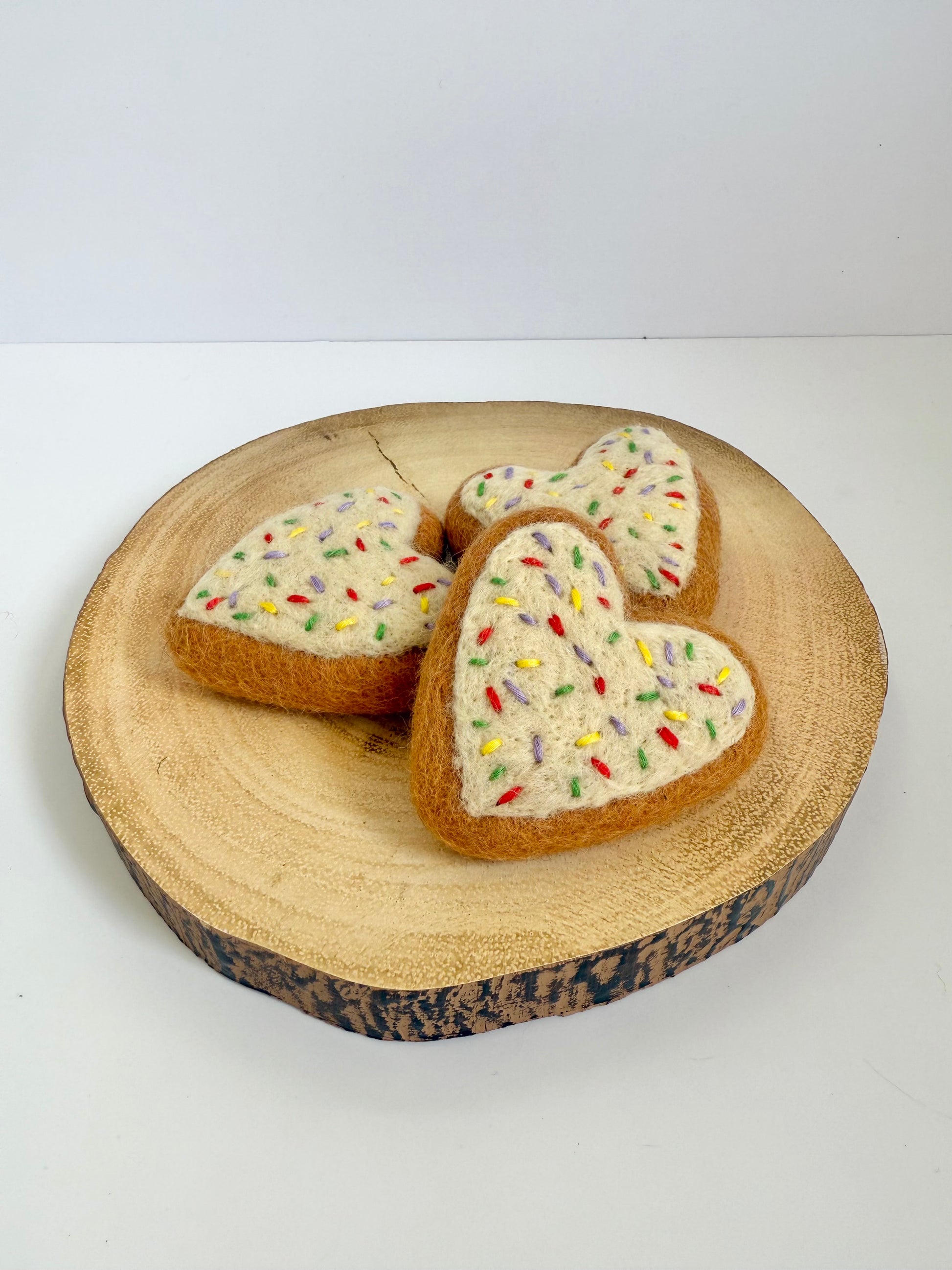 This sweet felt heart cookie is decorated with colorful sprinkles, perfect for pretend tea parties or play kitchen fun. Soft, cute, and easy for little hands to hold, it adds a cheerful touch to any toy bakery. Durable and lightweight, it’s a treat kids will love to “bake” and share again and again.