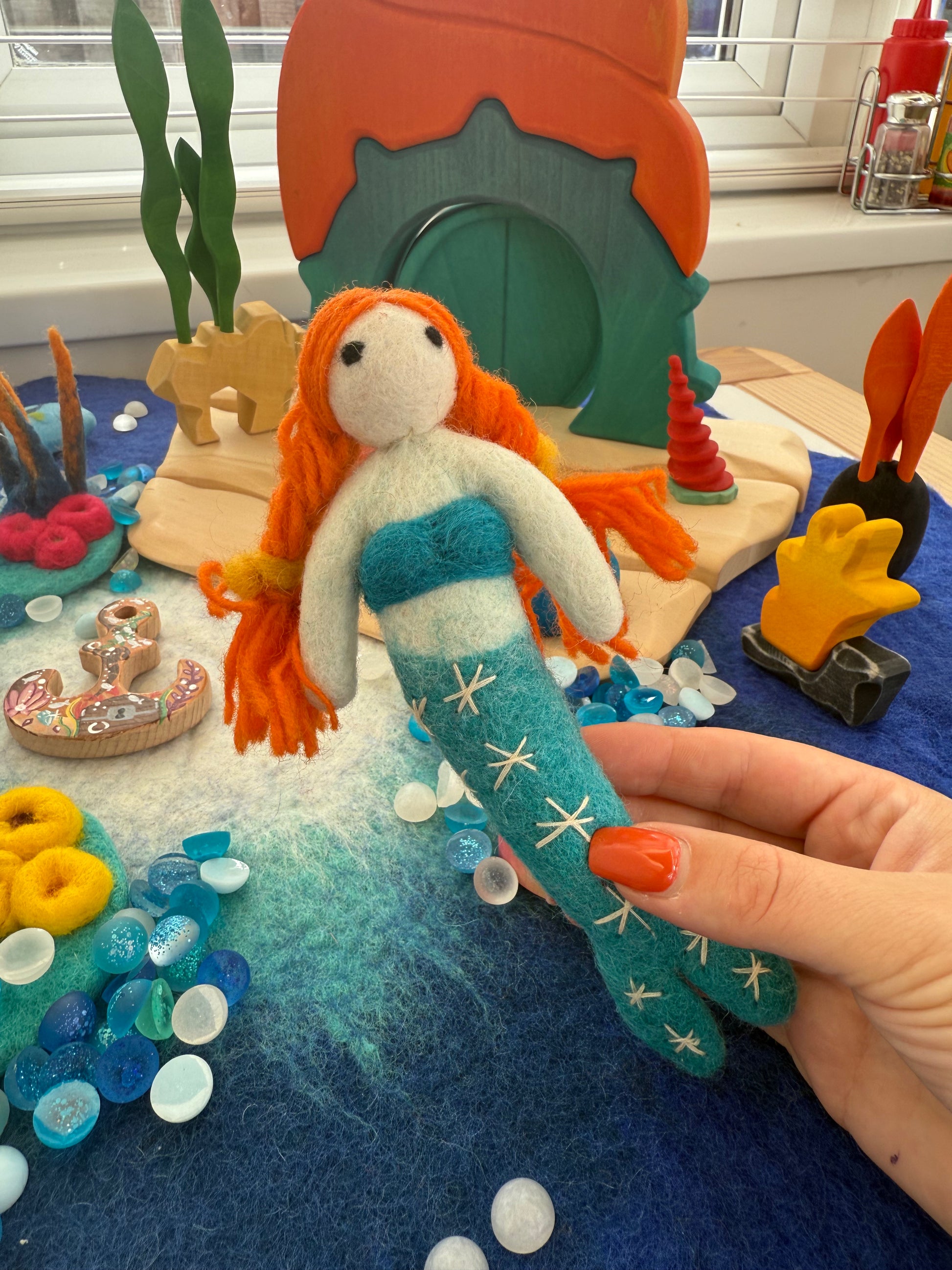 Handcrafted from soft, natural wool, these whimsical mermaids feature flowing yarn hair and gentle ocean-inspired details. A beautiful addition to small world play, storytelling, or as a magical keepsake.