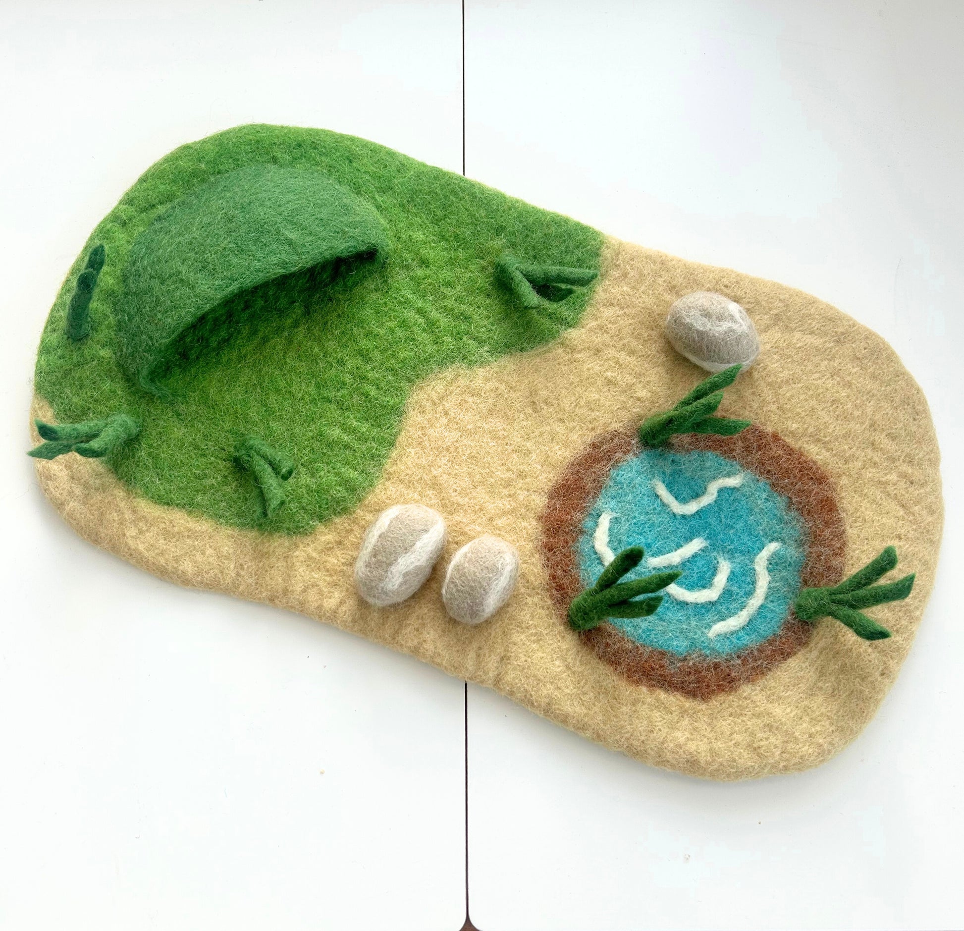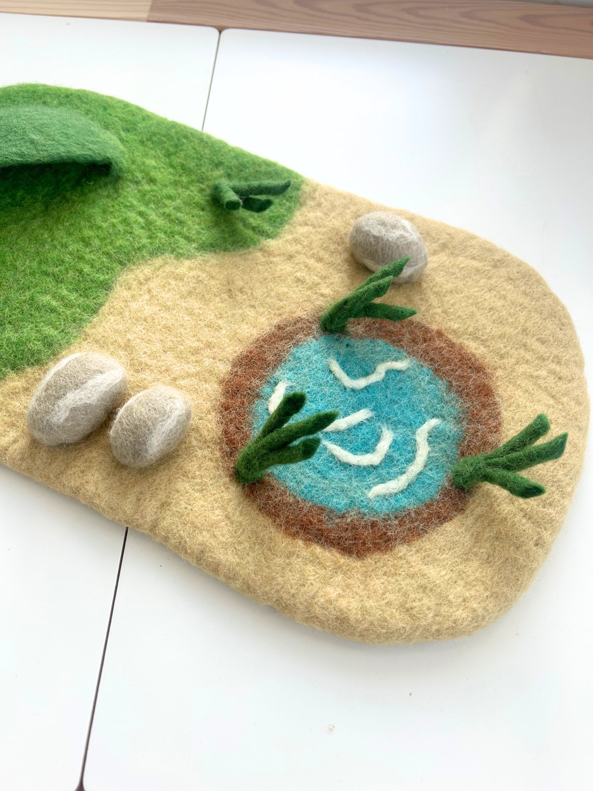 This felt safari mat will take your child on a wonderful journey through the dusty desert exploring all of wonders that the safari has to offer. It features a large cave and a water hole with 3D grass for animals to hide behind.