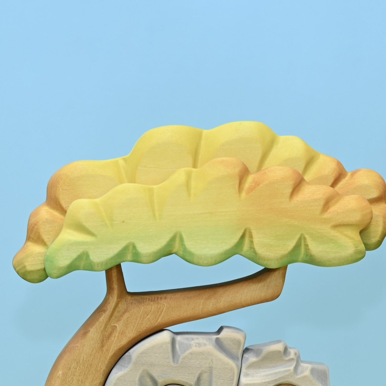 This beautifully crafted wooden toy depicts a cozy stone cottage nestled beneath a large, golden-leaved tree. The gentle curves and soft pastel tones create a peaceful woodland scene.
