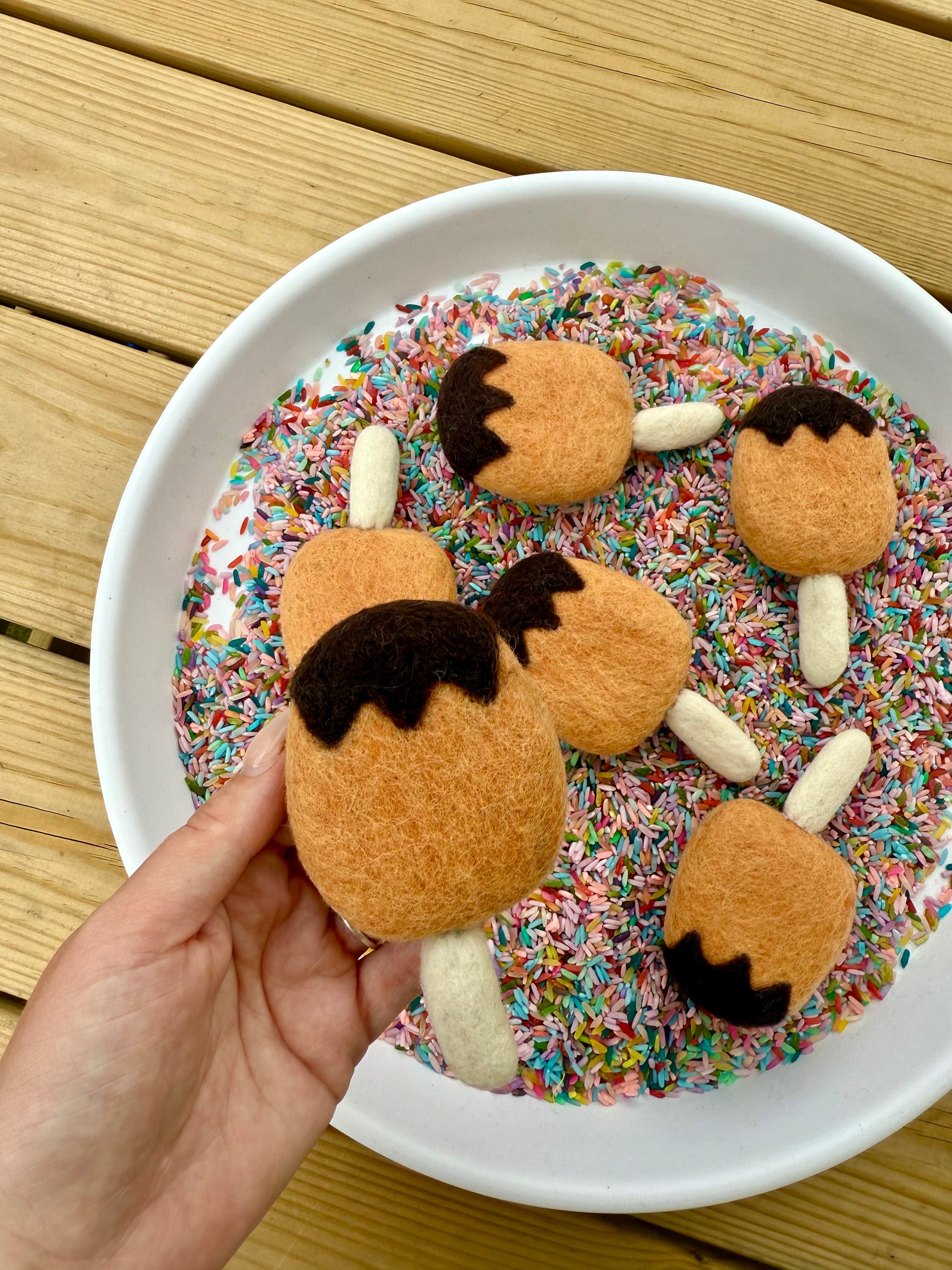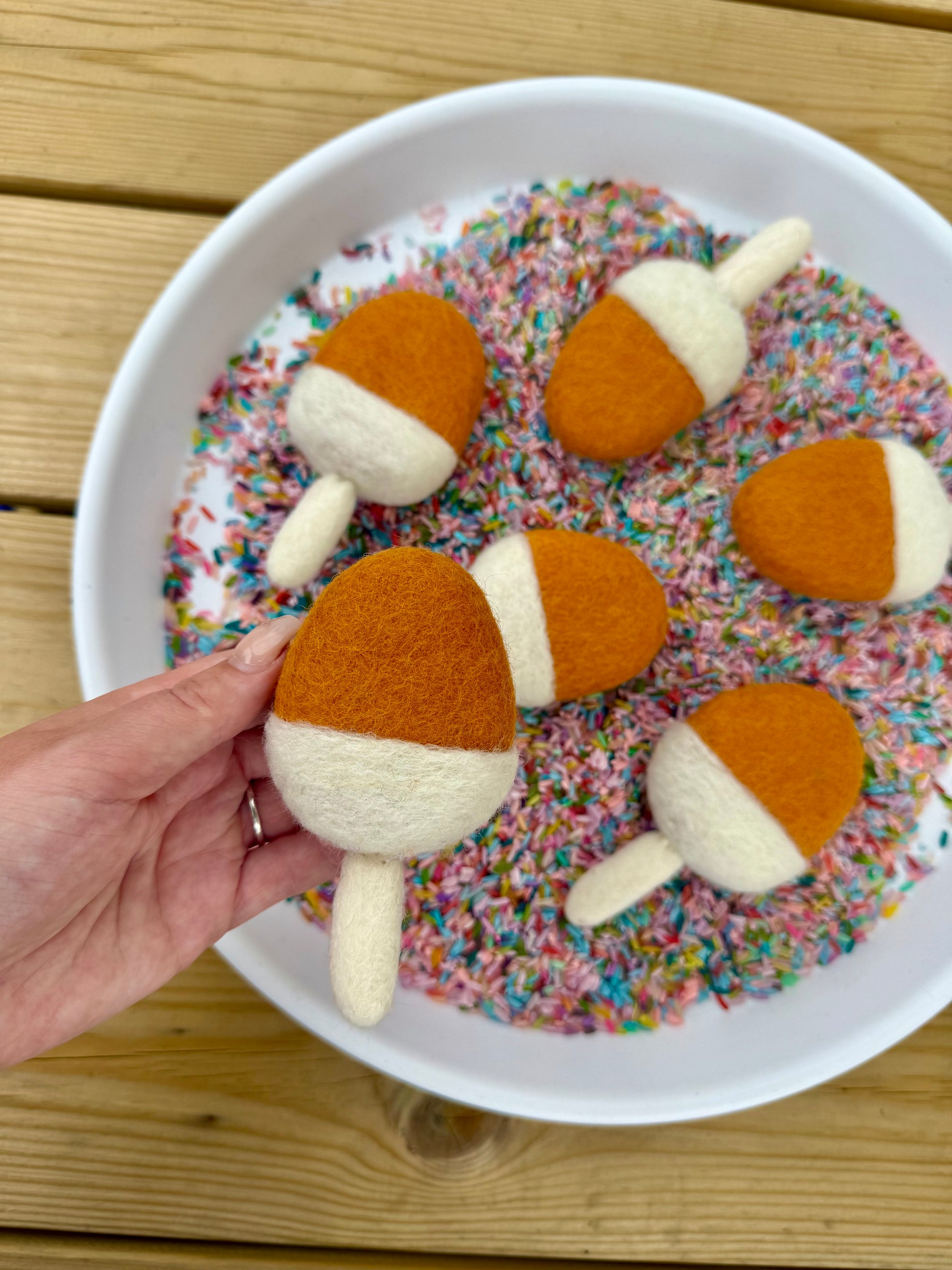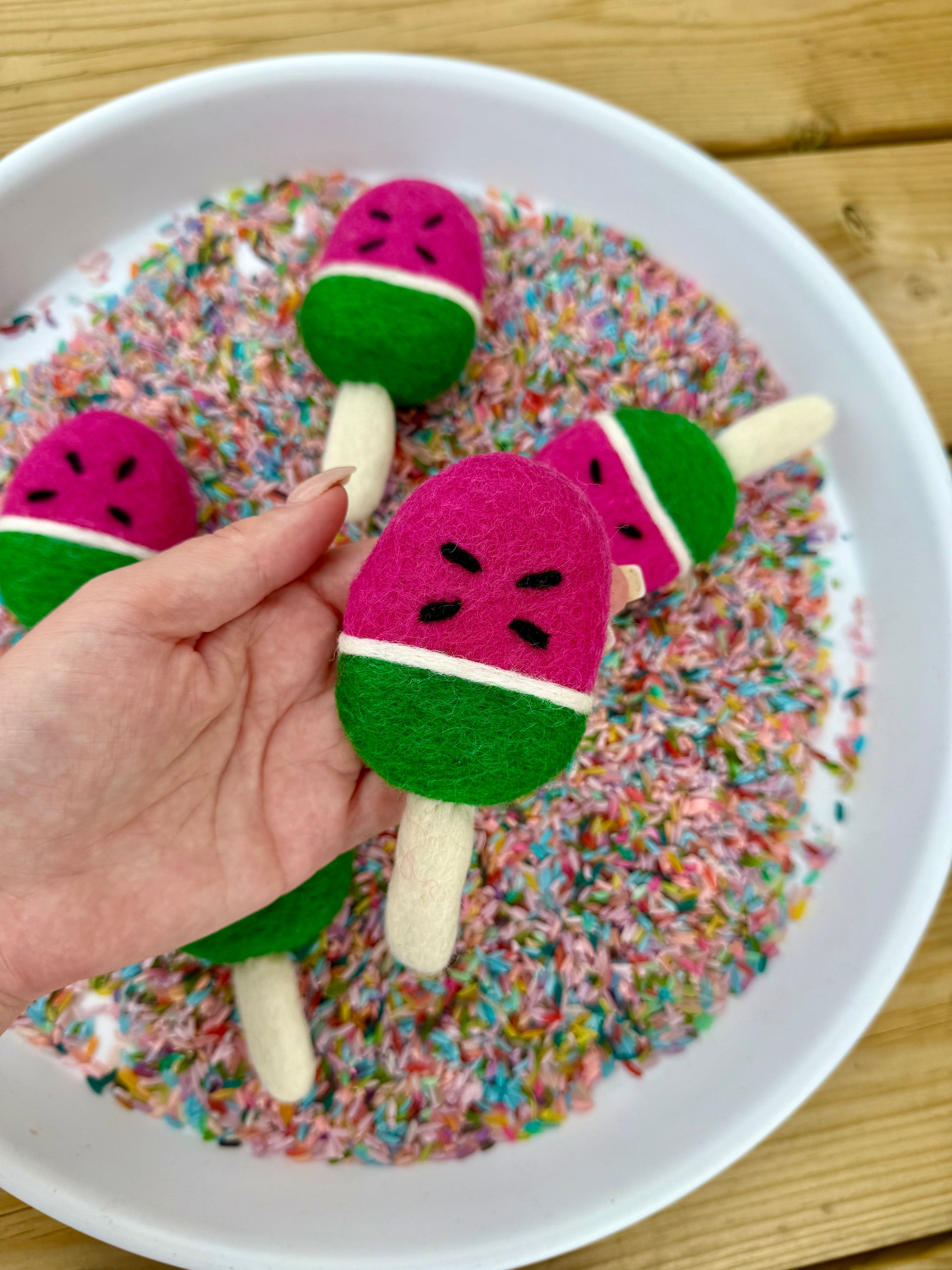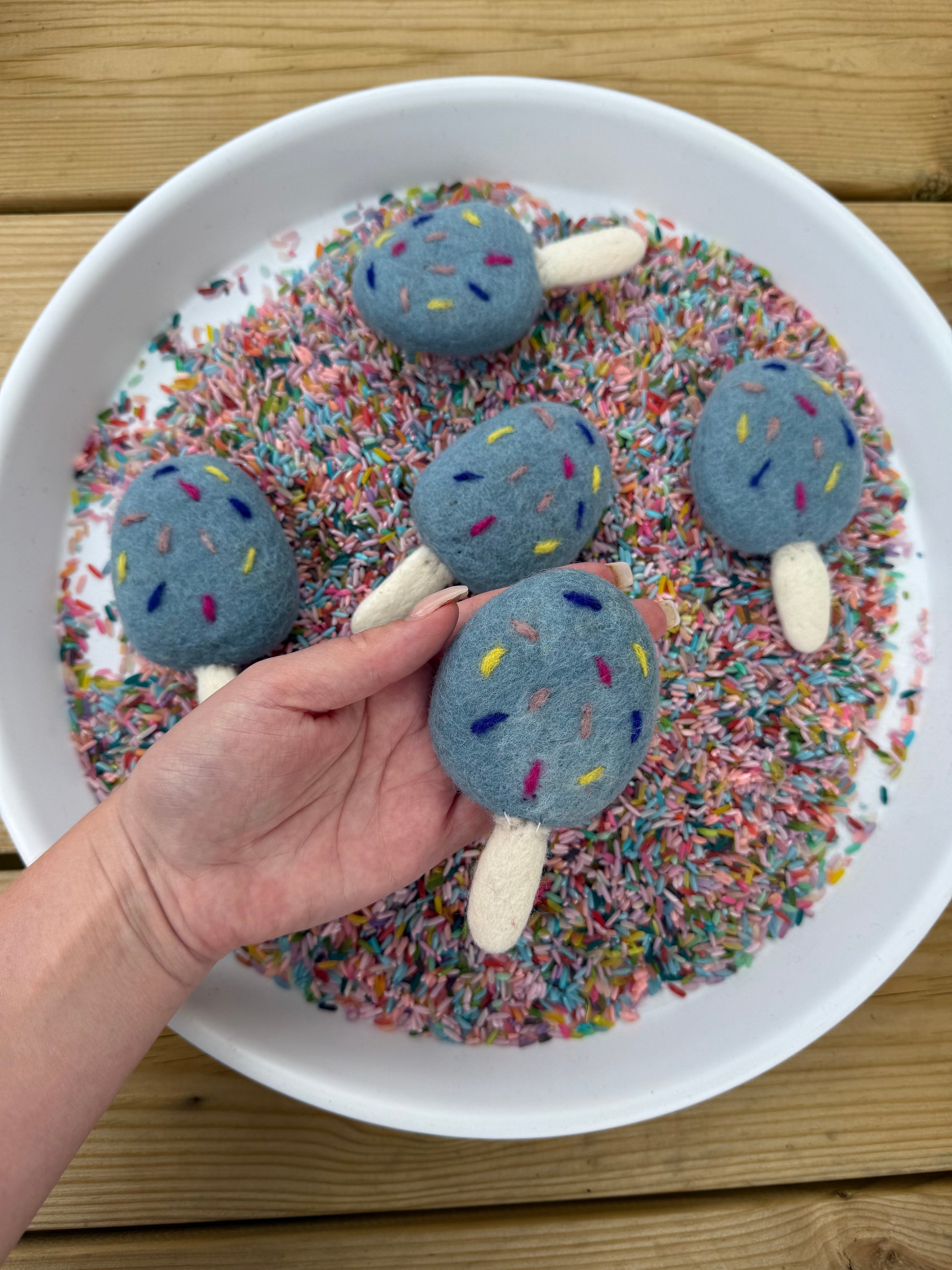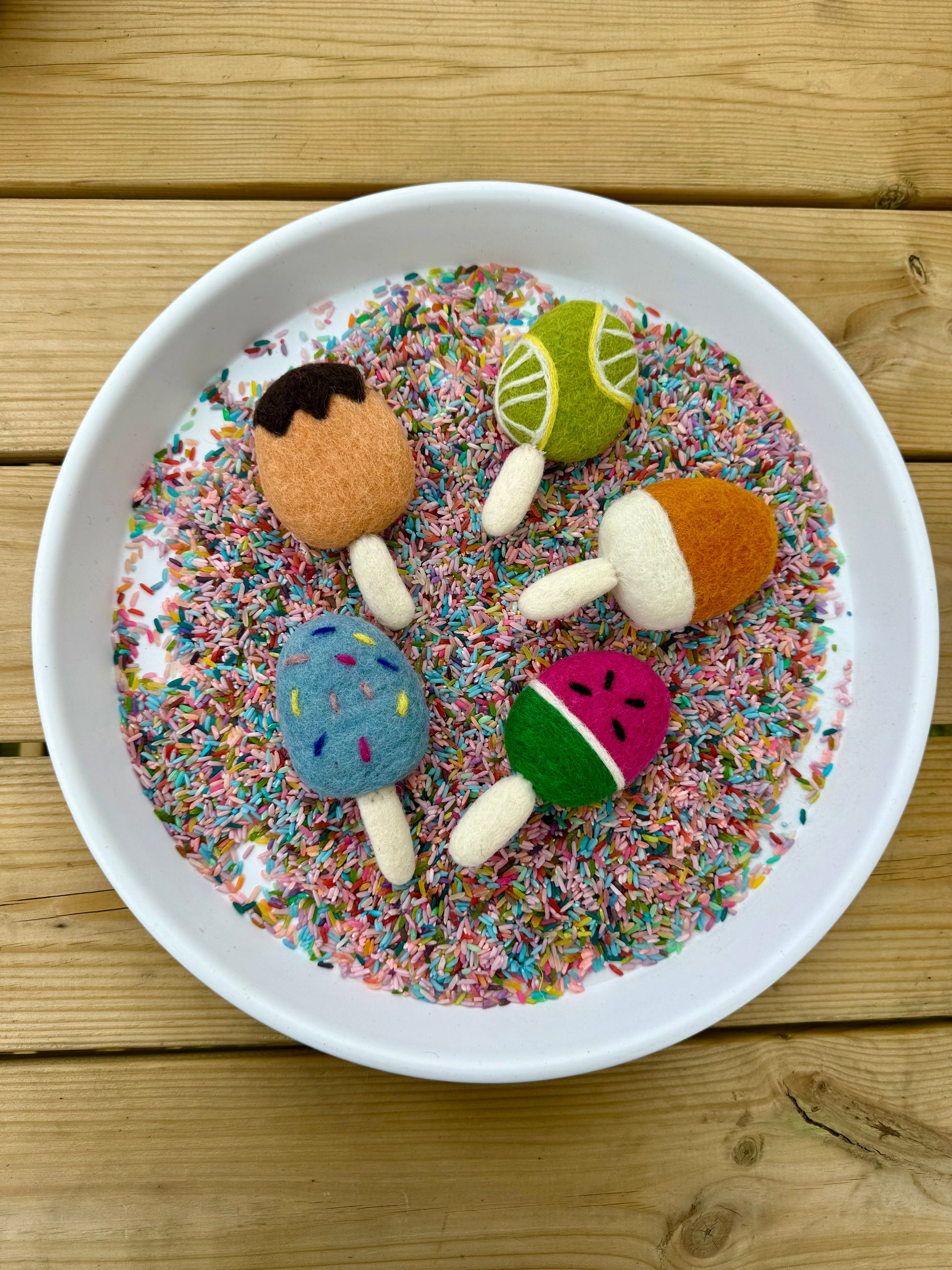 Felt ice lolly's Ideal for toddler sensory trays, play kitchens, quiet time activities, or Montessori-inspired learning, this felt ice lolly helps encourage creativity, role-playing, and tactile Discovery.