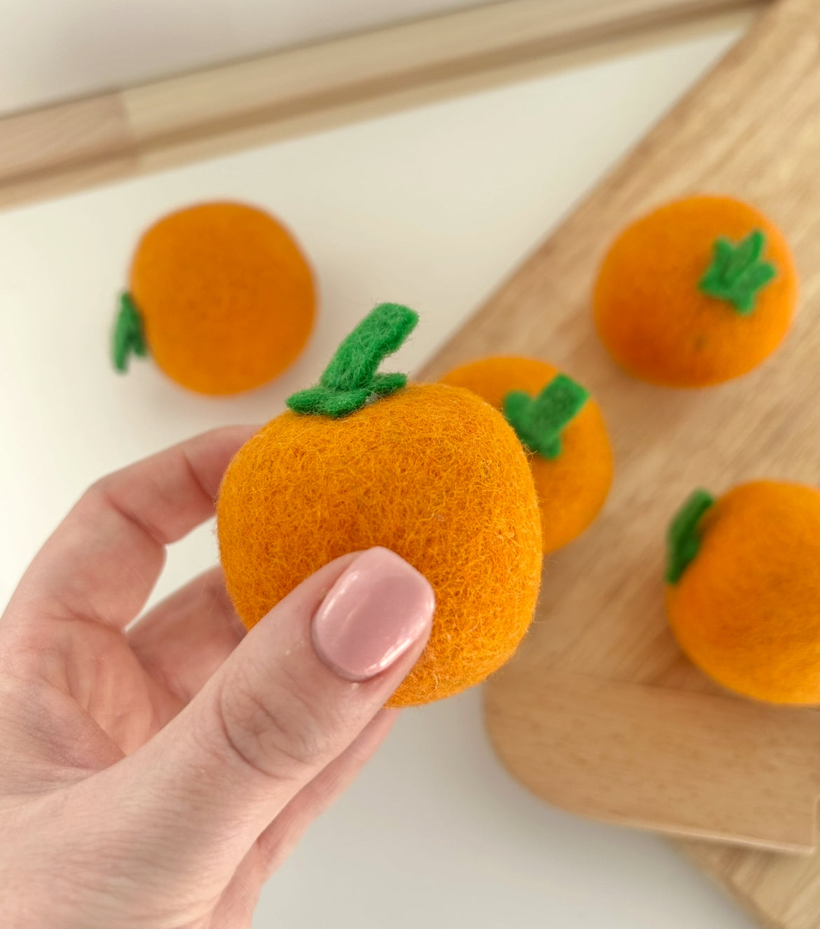 This needle-felted orange is a delightful and realistic handmade piece, crafted with intricate attention to detail. Using the traditional technique of needle felting, the orange is formed from soft, high-quality wool fibers, creating a vibrant, textured surface that mimics the natural look of the fruit. The bright orange colour and carefully sculpted shape make it a charming addition to any play kitchen, nursery, or decorative display.