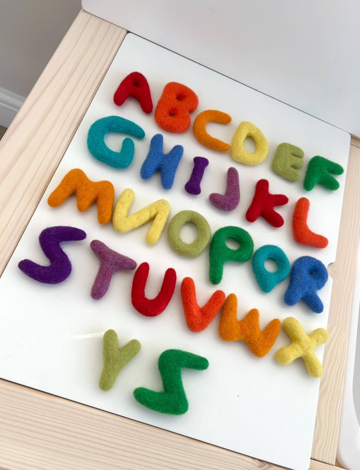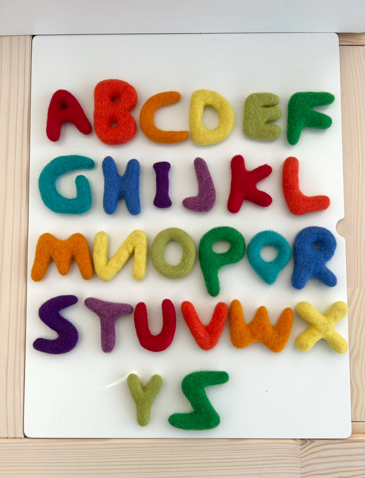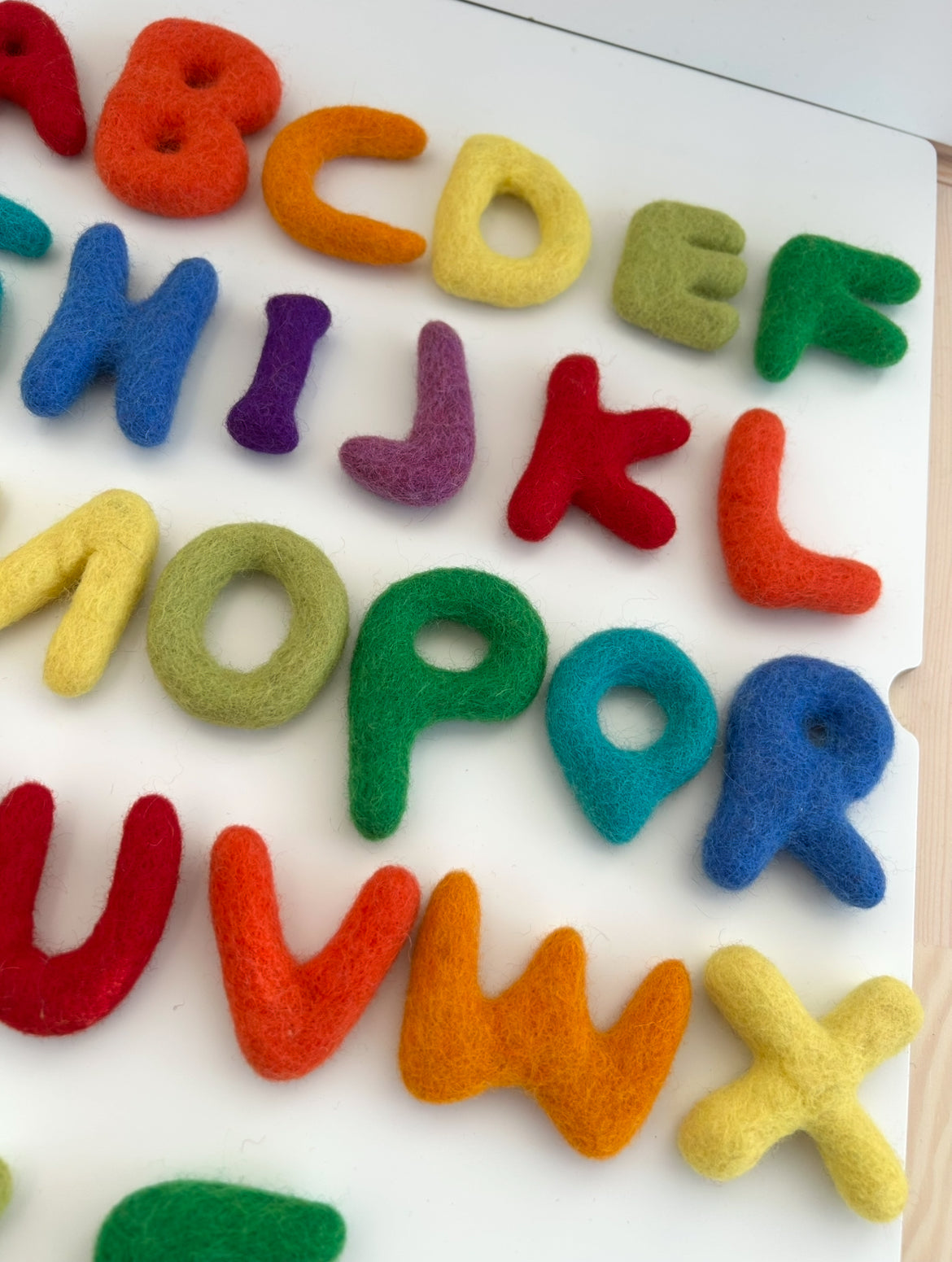 The rainbow felt alphabet is a colourful and fun way to introduce learning and creativity to any play. Each letter is carefully handcrafted from soft, high-quality wool felt, featuring a vibrant array of rainbow colours. The individual letters are designed to be both playful and educational, making them perfect for nurseries, classrooms, or craft projects.