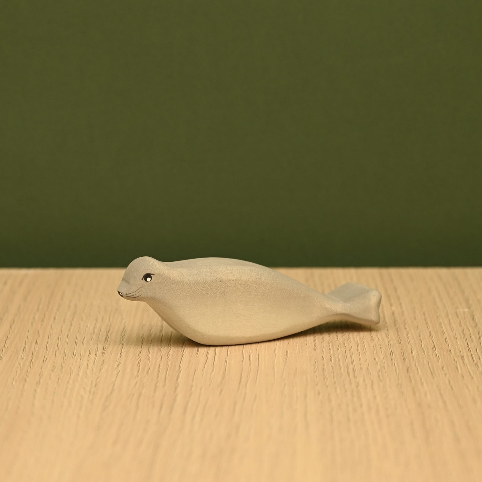 This gentle wooden seal is hand-carved with smooth curves that capture its relaxed, graceful form. Painted in soft grey tones, it has a calm expression and a tactile, natural finish. Perfect for ocean-themed play, this piece invites storytelling and pairs beautifully with other sea creatures.
