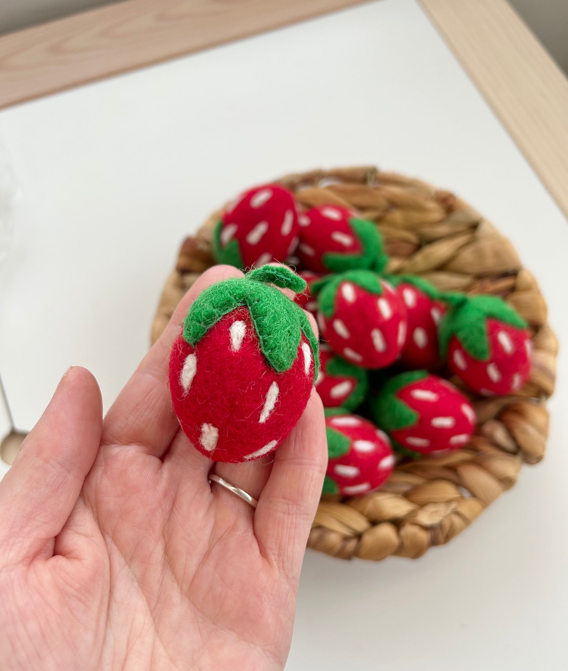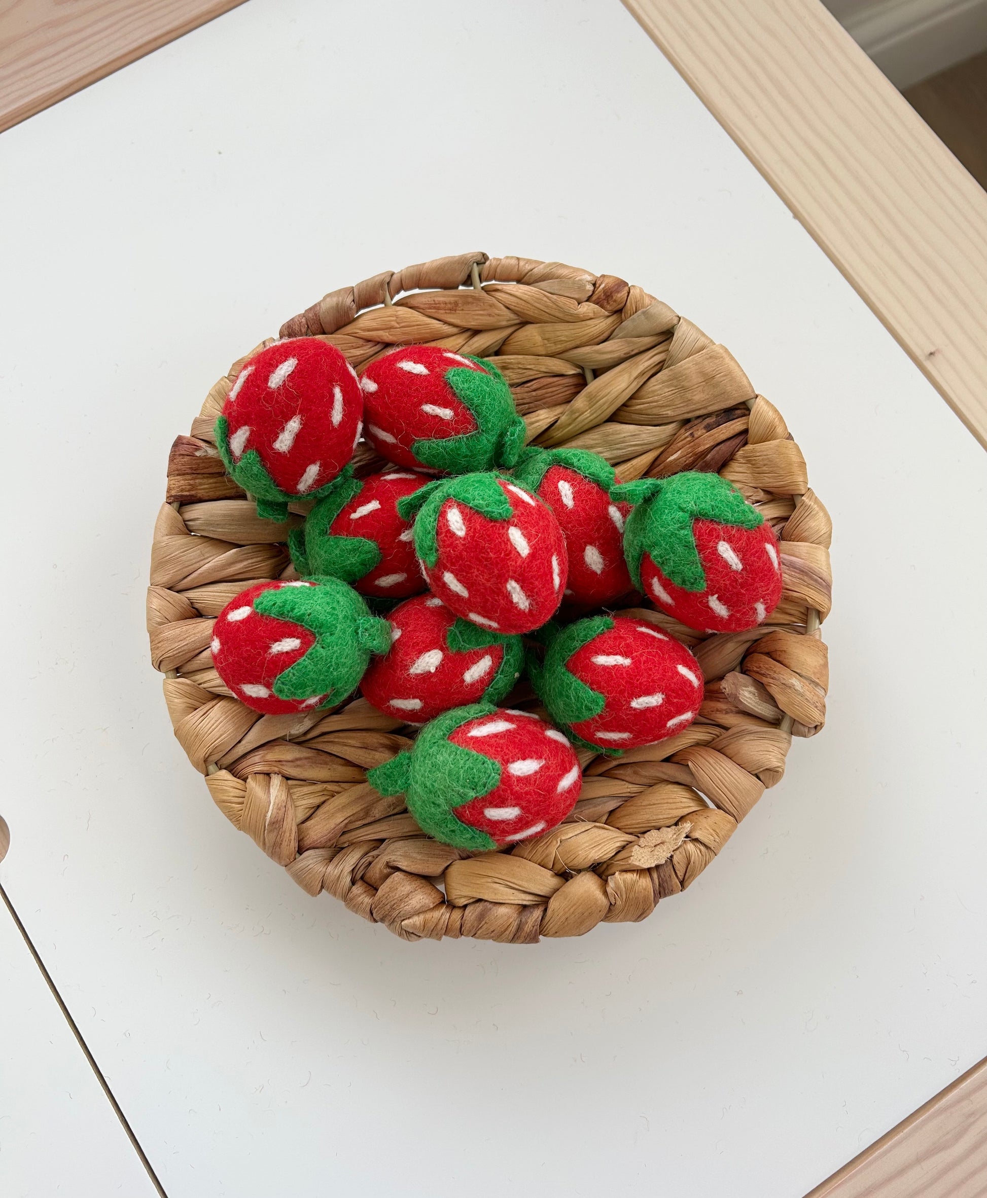 This needle-felted strawberry is a delightful and realistic handmade piece, crafted with intricate attention to detail. Using the traditional technique of needle felting, the strawberry is formed from soft, high-quality wool fibers, creating a vibrant, textured surface that mimics the natural look of the fruit. The bright red colour and carefully sculpted shape make it a charming addition to any play kitchen, nursery, or decorative display.